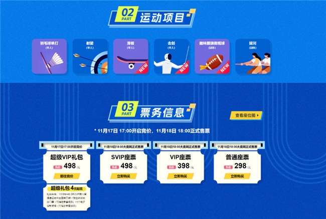 · 单人项目包括羽毛球、滑板、击剑、射箭,展现成员们的个人风采;