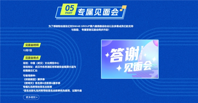 为感谢粉丝的支持,12月7日(周日)还将在中国(武汉)文化博览中心B展厅举办专属答谢见面会,活动时间从上午10:00持续至晚上18:30。 具体安排如下: